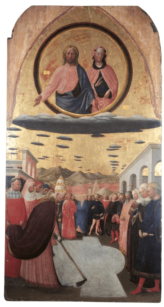 The Florentine painter created this altarpiece to commemorate the founding of Roman basilica Santa Maria Maggiore. Legend has it that the church’s site was chosen by the Virgin Mary herself, who caused snow to fall on that exact spot on the Esquiline Hill in the summer of 352—a scene rendered in Da Panicale’s panel. To some eyes, however, Da Panicale’s depiction of lenticular clouds looks akin to a fleet of alien spaceships, overseen by Jesus and Mary. Could the so-called miracle of the snow be an allegory for an invasion of flying saucers? It’s worth noting that even in the colder seasons, snow is rare in Rome. But then again, so are UFOs… presumably.