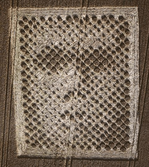 “One is a very strange rectangular formation with what looks distinctly like some kind of digital code displayed within it, the code being illustrated by standing patterns of crop. The second formation is also completely unique; at first it appears to be a random collection of standing circular clumps of varying sizes, also contained within a rectangle shape. However, as you get further from the pattern and gain some perspective, suddenly, and quite spookily, you see a face staring out at you from the crop field! Nothing like this has ever been seen before.