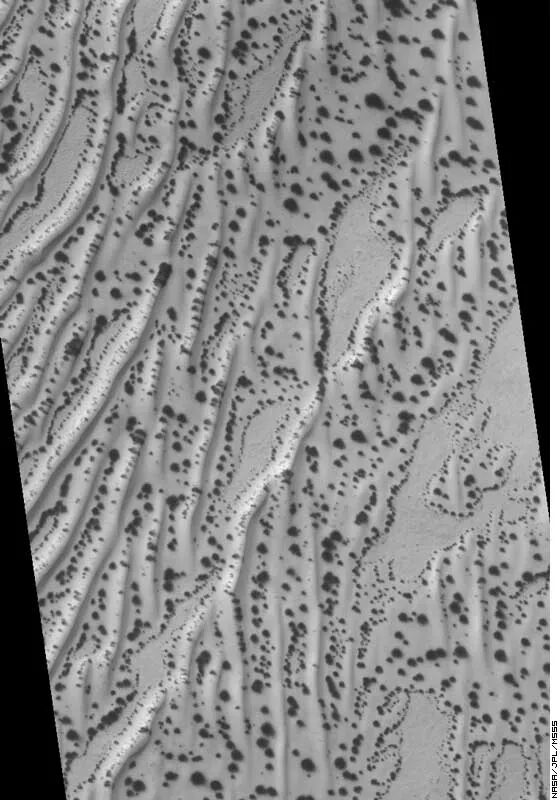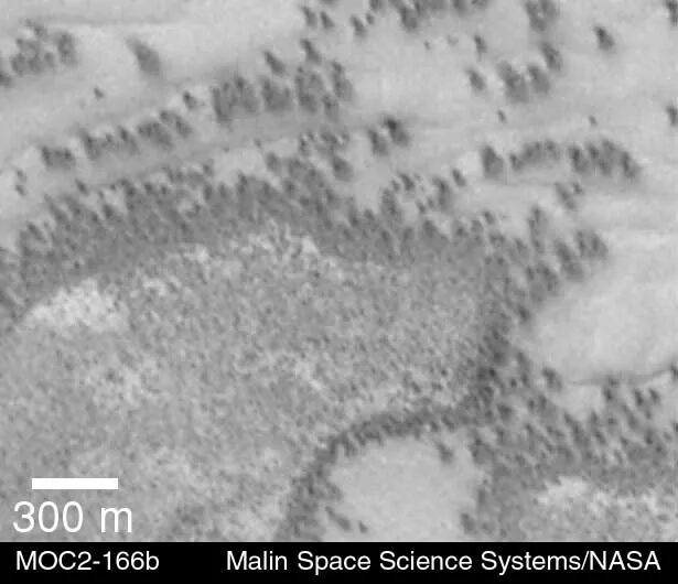 This photo, taken by the Mars Global Surveyor (MGS) look quite like aerial photos of an Earth desert dotted with shrub growth. But these sand dunes are in the southern hemisphere of Mars. A Hungarian research team, which has been analyzing the photos (and other photos of the same area over time), has concluded that the black dots are indeed living organisms.