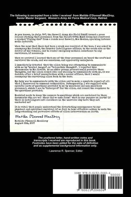 The author of the book, Lawrence R. Spencer claimed to have received a letter from Matilda where she disclosed information about the series of interviews with Airl. She wrote that the Domain Expeditionary Force, a race of beings, had been conducting operations in the solar system for the past 10,000 years and using the asteroid belt as an intergalactic base.