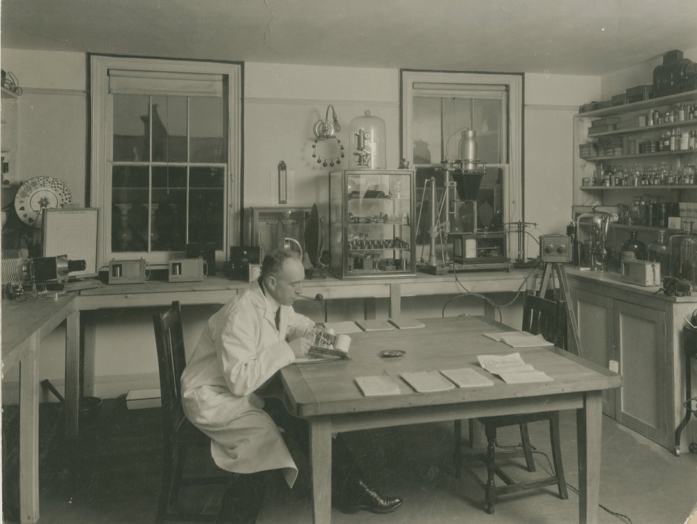 Photograph of Harry Price at the National Laboratory of Psychical Research, c. 1930, fixing machinery